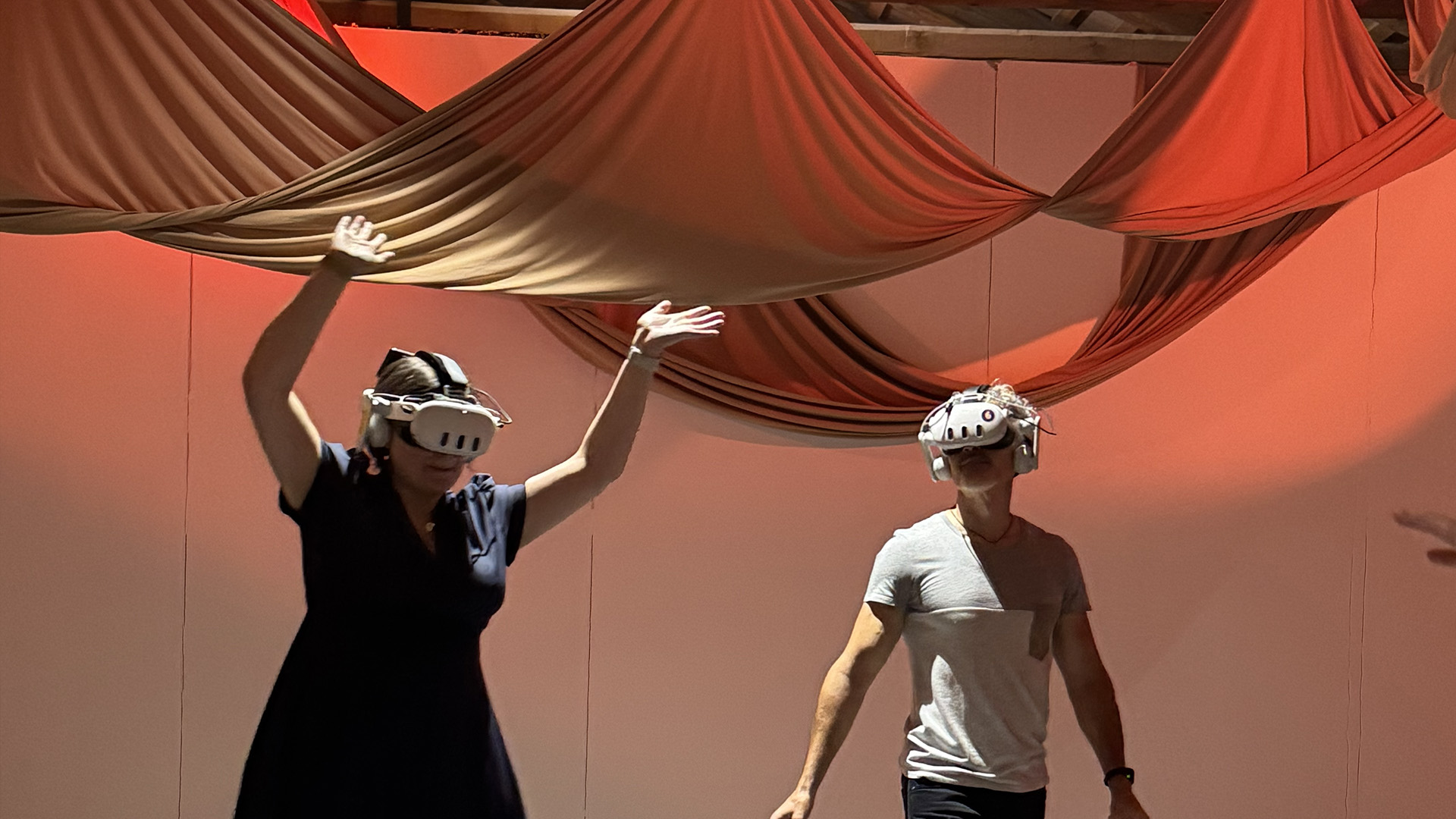 Une fois que nous avons rencontré cette version de nous-mêmes, nous sommes invités à rencontrer un·e autre participant·e, sous la forme de son propre avatar de mouvement, et à synchroniser nos mouvements et notre musique ensemble. Ensemble, nous rejoignons le reste du groupe, découvrant les différentes manières dont les autres existent à travers le mouvement, pour créer un moment de danse collective et joyeuse. Enfin, les derniers moments passés ensemble nous invitent à envisager d'autres incarnations : nous avons la possibilité d'essayer différents avatars de mouvement, de ressentir l'identité de mouvement d'autrui.
