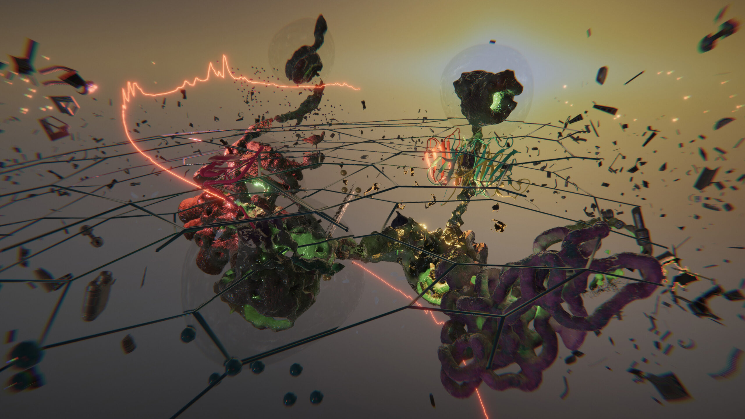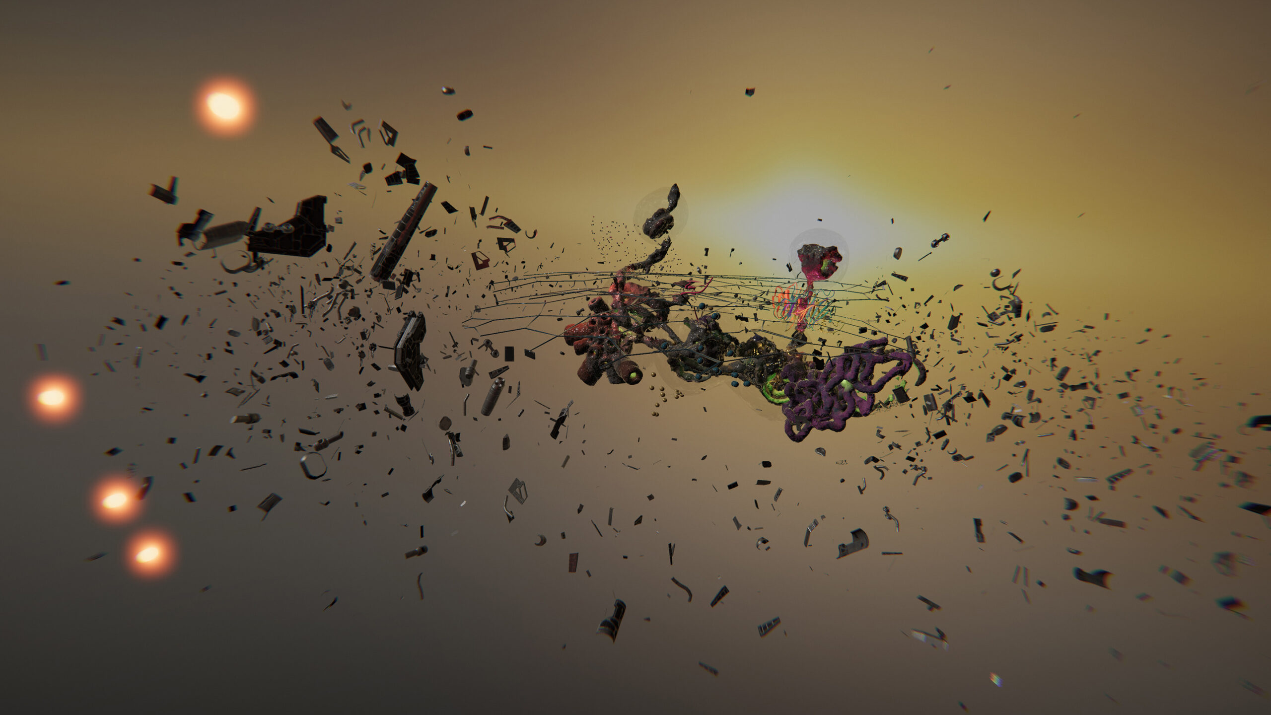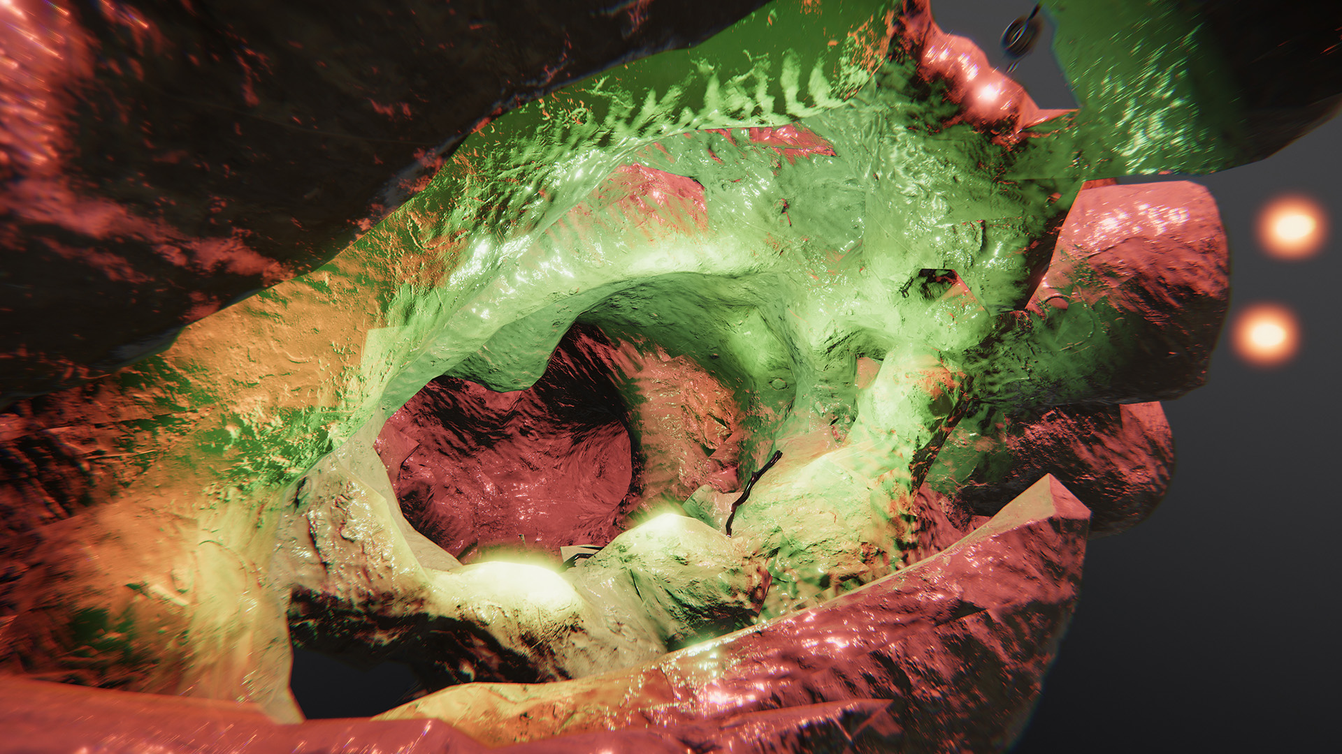 Velocity Holomatrix Warp 7 is an algorithmic audiovisual artwork. Explore planetoid VHW7 and its ecosystems filled with strange phenomena like disorienting ionic bubbles, levitating ore deposits and phosphorescence anomalies. And listen to the magnetic, electric and gravitational forces that shaped and maintained VHW7 in balance through audio composed by artificial intelligence.